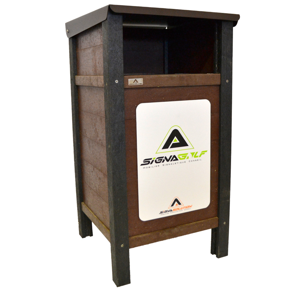 Massive Abfallstation aus recyceltem Kunststoff mit einem klappbaren Deckel und einem Fach. Der Einwurf kann individuell gestaltet werden.